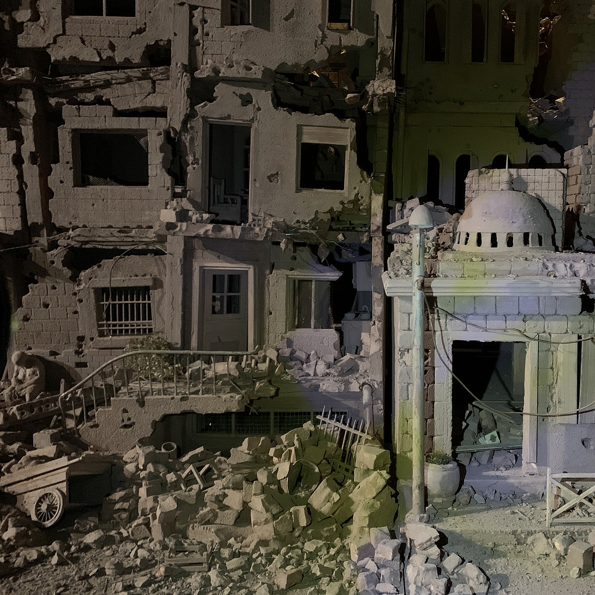 De maquette verbeeldt een fictieve plek, maar doet direct denken aan echte wijken in Damascus.